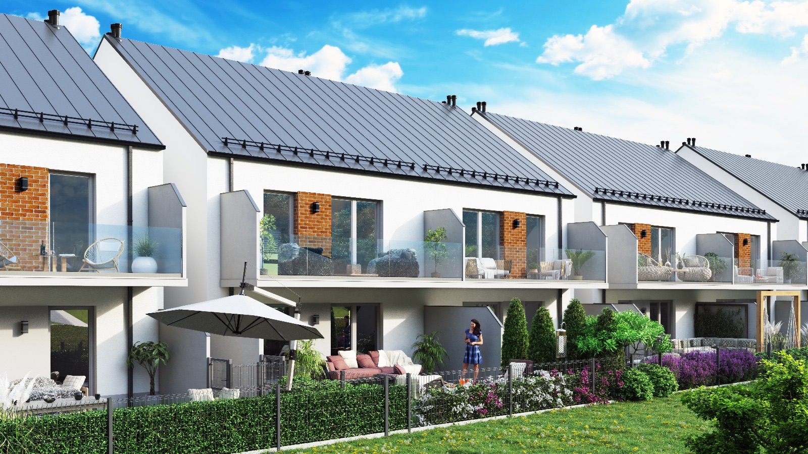 Balkony mają 1,5 m szerokości i rozciagają sie na całej długości szeregowca.