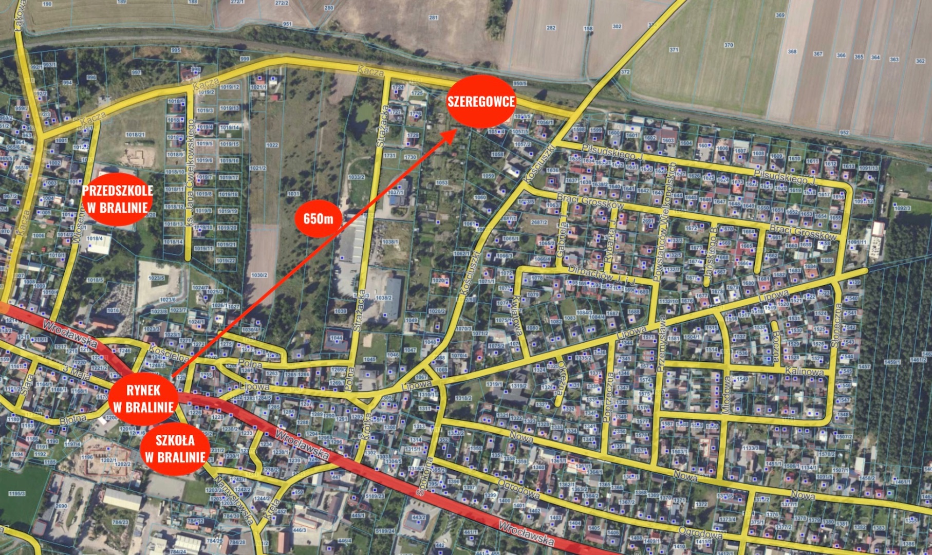 63-640 Bralin, ul. Kacza (obok numeru 23). Stąd jest wszędzie blisko. Do sklepów, do Rynku, do szkoły podstawowej, do przedszkola, do NFZ, apteki, boiska, terenów sportowych („Sokół” Bralin), itp.